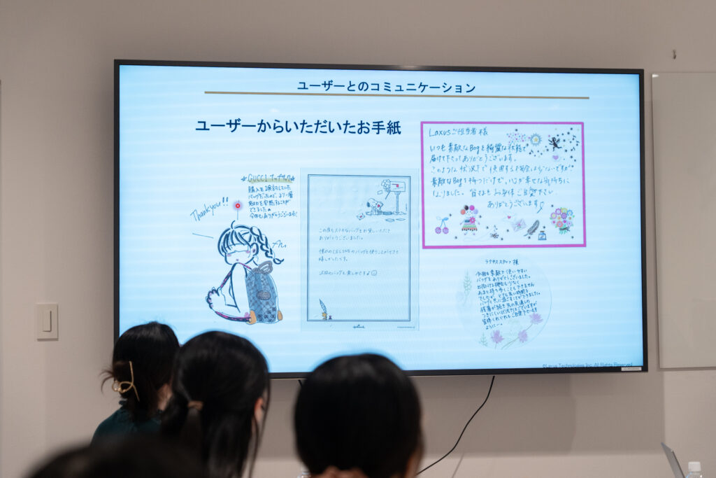 サービス概要から、ブランドバッグのシェアリングという事業特性、ビジネスモデル、事業に込めた想い、今後の展開まで、数字とストーリーの双方から丁寧に紹介されました。